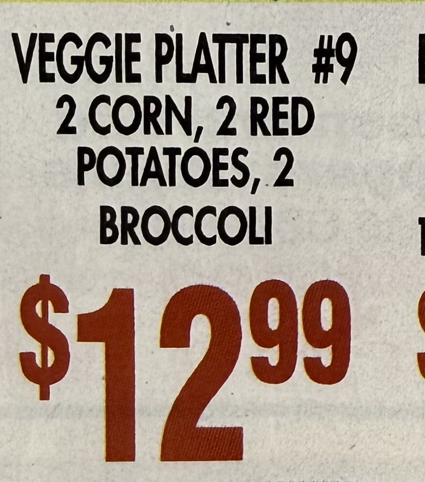 platters come with corn, broccoli, and potatoes